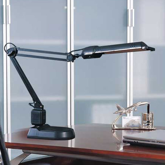 This is an LED desk light with a fashionable design. It features an adjustable arm for added convenience. The LED light source lowers energy costs and has a long service life.