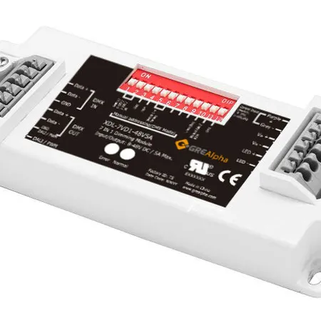 Pictured here is a 7-in-1 dimming module for LED control use. It has connection ports on the side and offers 12 buttons for separate on/off control. This LED dimming module flaunts a durable construction and can provide smooth and flicker-less light dimming.