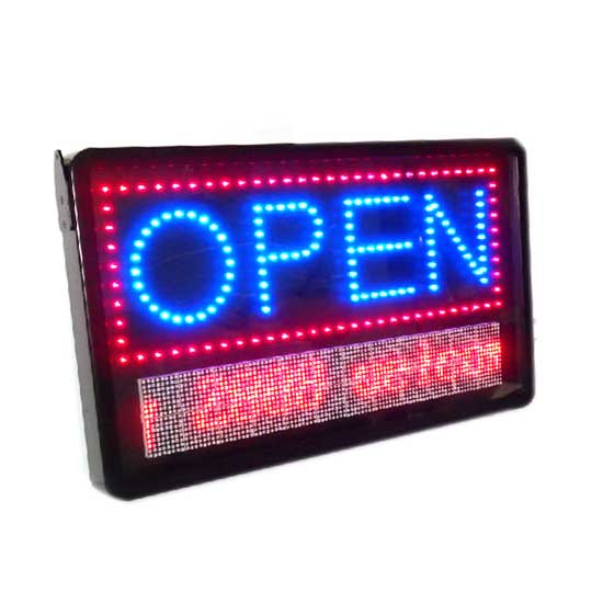 This sign display adopts super-bright LEDs as the light source. It consists of a fixed LED "open" sign image and other programmable message display. This LED display is ideal for assorted commercial purposes.