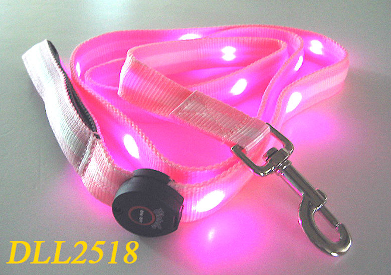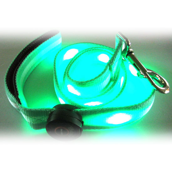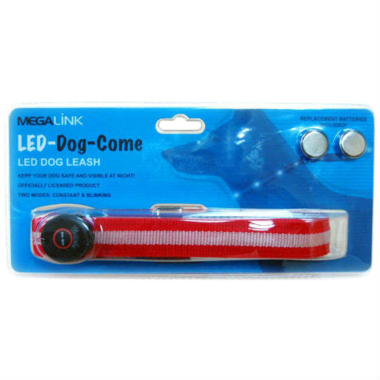 This LED dog leash features LED lights around the collar to keep your dog safe and visible at night. With a simple push button, this LED dog collar and lead include easy-to-replace batteries. The fun and colorful design brings a fashionable touch to the nighttime safety for you and your pet. Light up the darkness with designer-style and brilliant LED illumination!