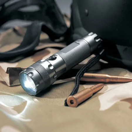 The LED flashlight is completed with a high-powered design. It is constructed of robust aluminum for lasting service. This piece can be carried easily with its hand strap.