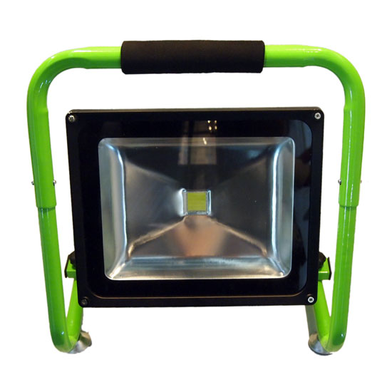 The featured LED floodlight flaunts bright and persistent lighting. The sharp green stand base earns eye-catching attention. This rechargeable LED floodlight with an ergonomic handle allows easy carrying for users.