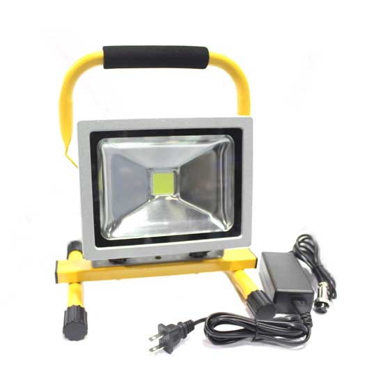 This rugged floodlight with a yellow frame is made of aluminum and tempered glass for durability. It is fitted with high quality LEDs for a great lighting effect. The handle design on the top makes it easy to transport.