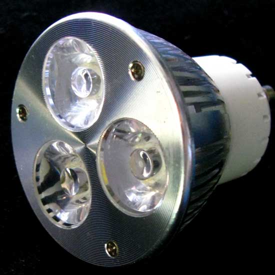 As shown is an LED halogen bulb with a high color rendering index. This piece is compatible with GU5.3, GU10, E26 and E27 lamp bases. The 3 high-power LED light sources can offer superior brightness.