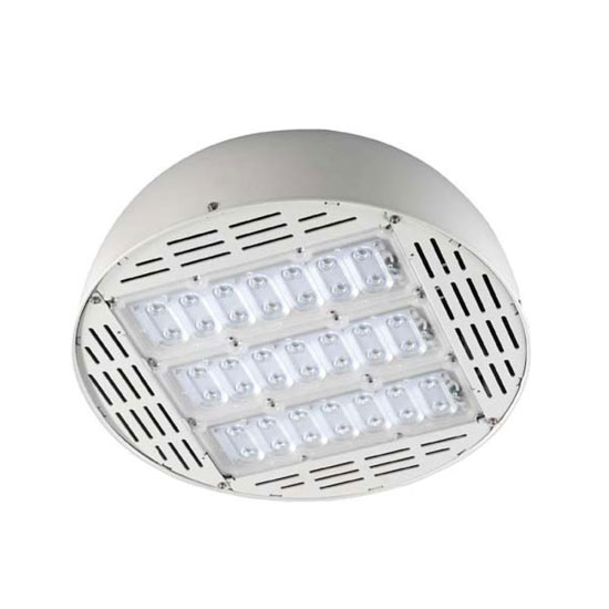 Displayed is a high bay light coming in a round shape. It is fitted with highly efficient LEDs for powerful illumination. It is ideal for both factory and warehouse use.