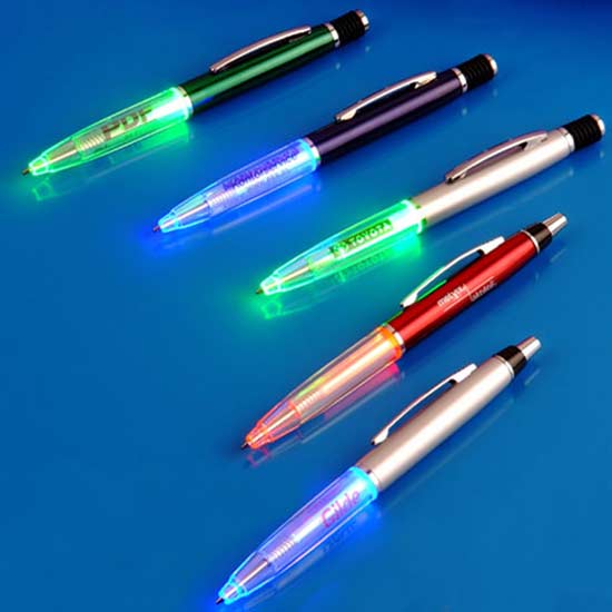 These special ball pens come with bright LED lights in various colors. Featuring a retractable style, each pen comes with a reliable pen clip. The metallic finish offers added style to the pens.