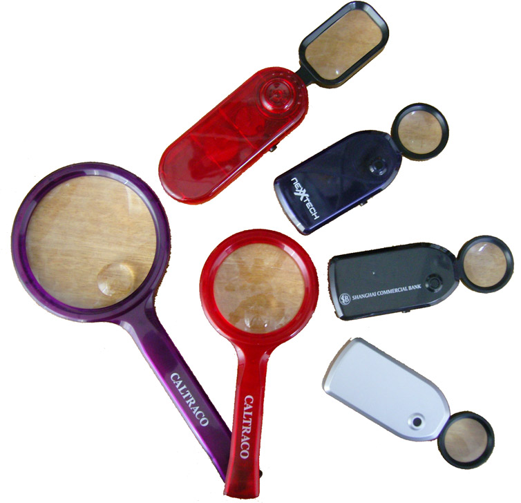 Showcased is a series of magnifiers designed in a pocket size for users to store easily in pocket, purse or handbag. These magnifiers are made into various designs and different power magnification frames for selection. These swing out pocket magnifiers contain built-in LED lights, making it the perfect use in the dark for providing adequate shine on reading material to improve print contrast.