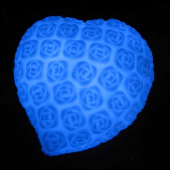 Highlighted is an LED mood light in a romantic heart shape with a color-changing function. The delicate rose patterns offer added style. Enhance your bedside decor with this LED mood light.