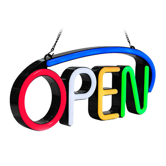This neon open sign is fitted with an LED light source. It comes in bright colors for a vibrant look. This LED sign is widely used in small shops.