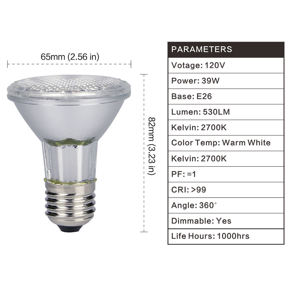 | PAR20 | GMY-PAR20 100-240V 6W E27 3000K | glass | AC100-240V 50Hz | 0.03 | 6 | 450 | 3000 | >80 | ≥0.5 | Φ66*83 | E27 | SMD 2835 | |