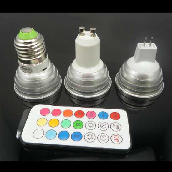 Pictured is a series of LED RGB light with different bulb bases. A remote controller is included for convenient operation. These color-changing LED bulbs are perfect for assorted commercial lighting applications.