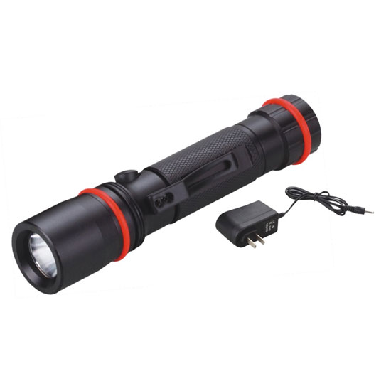Showcased here is an LED rechargeable flashlight. A durable construction makes this flashlight ideal for outdoor use. A rechargeable design makes this flashlight eco-friendly and cost-saving.