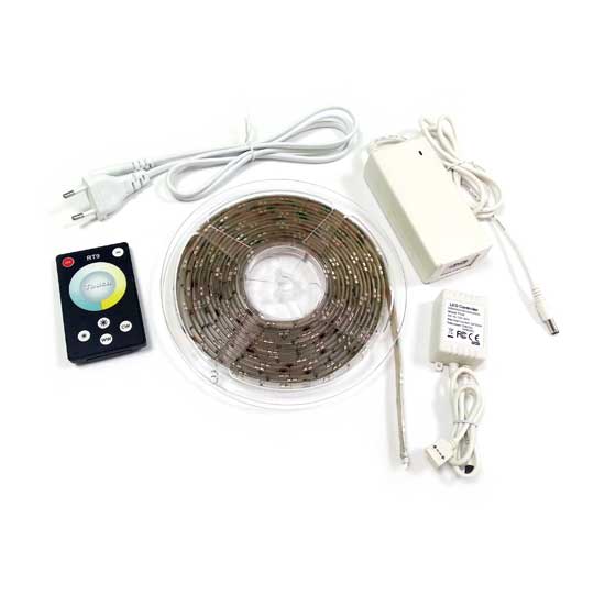 This is a flexible LED strip with 150x warm white and cool white LEDs. This product comes with a remote control with a dimming function that is controlled by touching the color wheel. It also can show the static cool white and static warm white by touching "CW" and "WW" keys.