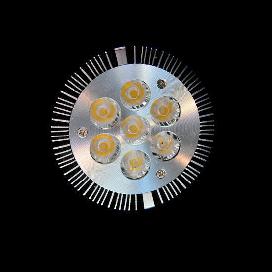 Displayed here is an LED spotlight constructed with heat-sink fins for efficient heat dissipation. The seven small LED bulbs provide stable illumination with long lifespans. This LED spotlight is great for both residential and commercial lighting applications.
