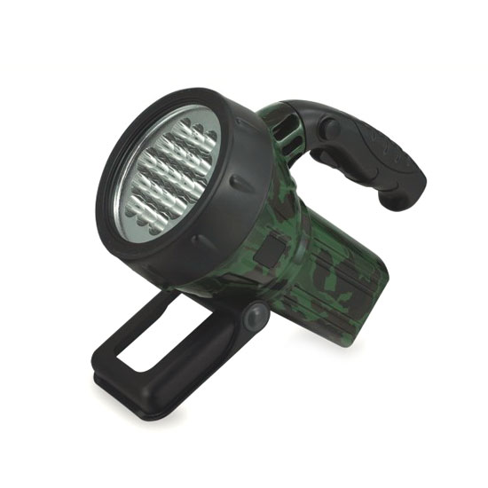 This is an LED spotlight with a black finish. It offers bright white light for illumination. The handle is professionally made for easy holding.