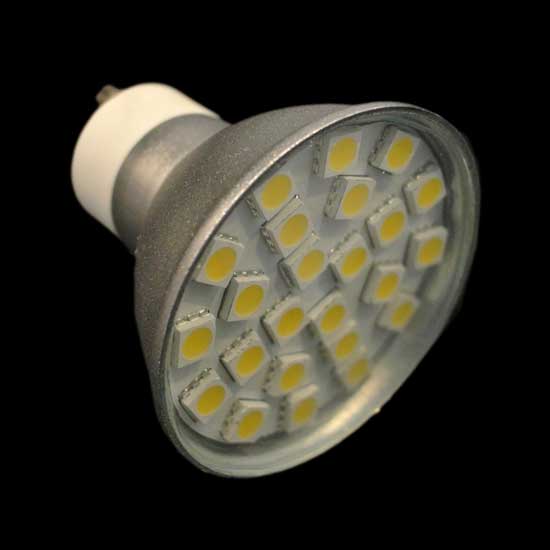 This LED spotlight bulb features 24 SMD LEDs to yield high light outputs. It is designed to be compatible with the GU10 lamp base. This bulb is assembled with a sturdy casing which endures long service.