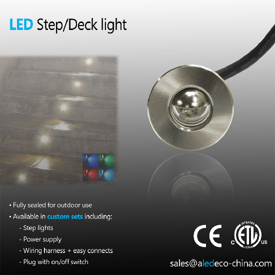 Let the pavement twinkle in the night with these step lights rated sate for outdoor use. Consuming merely 0.4W, the lights illuminate with maximum efficiency for a long life span. The round plastic housing comes in chrome finish, black or white coating, available in a set with customized wire harness.