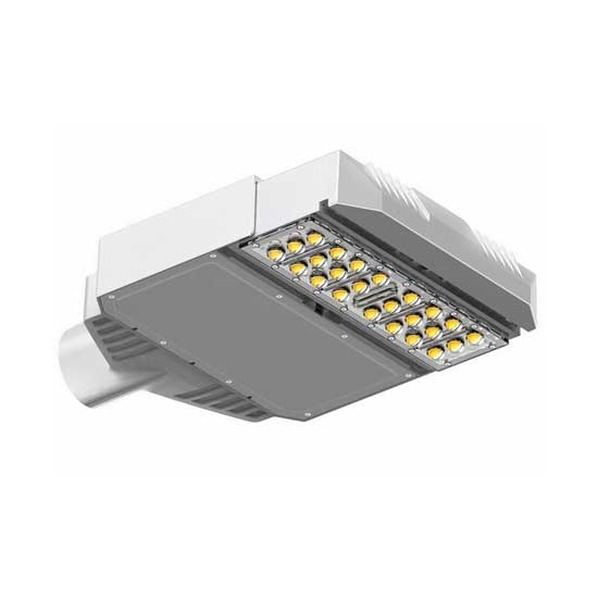This is an LED street light with a silvery finish. The LED street light features 24 highly-efficient LEDs to offer even light distribution for a wide area. It consumes only 30W of power.