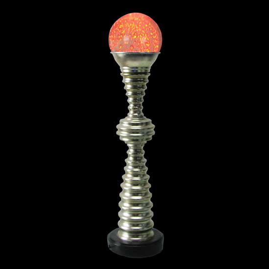 Outlined is an LED table lamp with a futuristic and unique look that has a red globe on the top. The lamp body with a metallic appearance showcases a touch of stylishness. This LED table lamp is a good lighting choice to bring differentiation.