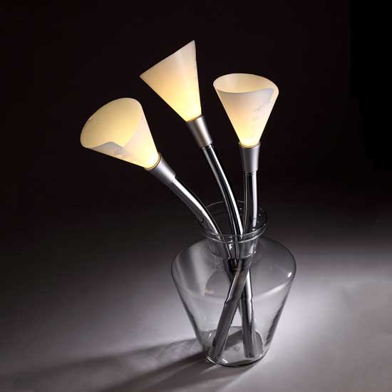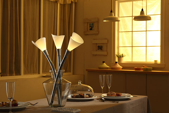 This novel LED table lamp features the design of three beautiful lily flowers in a vase. The table lamp emits soft yellow light to create a relaxed mood. The delicate table lamp will brighten up any home decor.