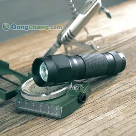 Displayed is an LED torch that is shock-, dust- and water-resistant. This high quality LED torch enjoys a lifespan of 50,000 hours and can run consecutively for 8 hours. This energy saving torch performs brightness of 60 lumens with a light range of up to 100 meters. This torch is powered by AAA batteries, which are cheap and widely available.