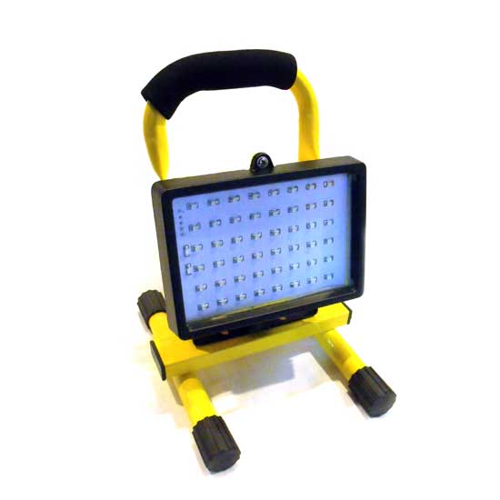 Displayed is an LED work light that comes with a large panel and a robust stand. Professionally made, this work light uses high quality SMDs for brilliant illumination. This energy saving work light is rechargeable and has a long service life.