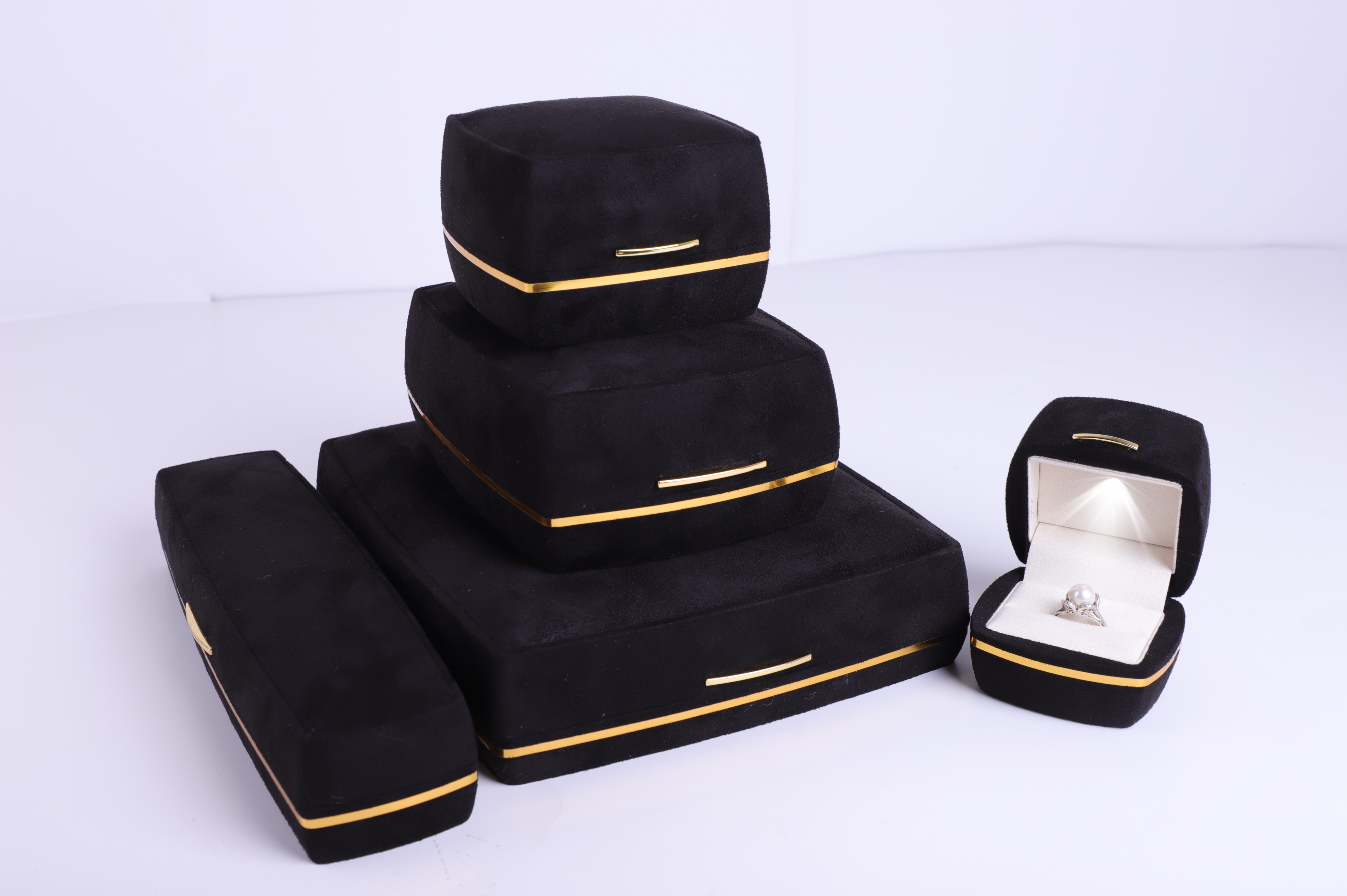 Jewellery boxes in bespoke shapes, with customisable materials and logos. Options include LED lighting and gold edging, while the inner lining may also be altered.