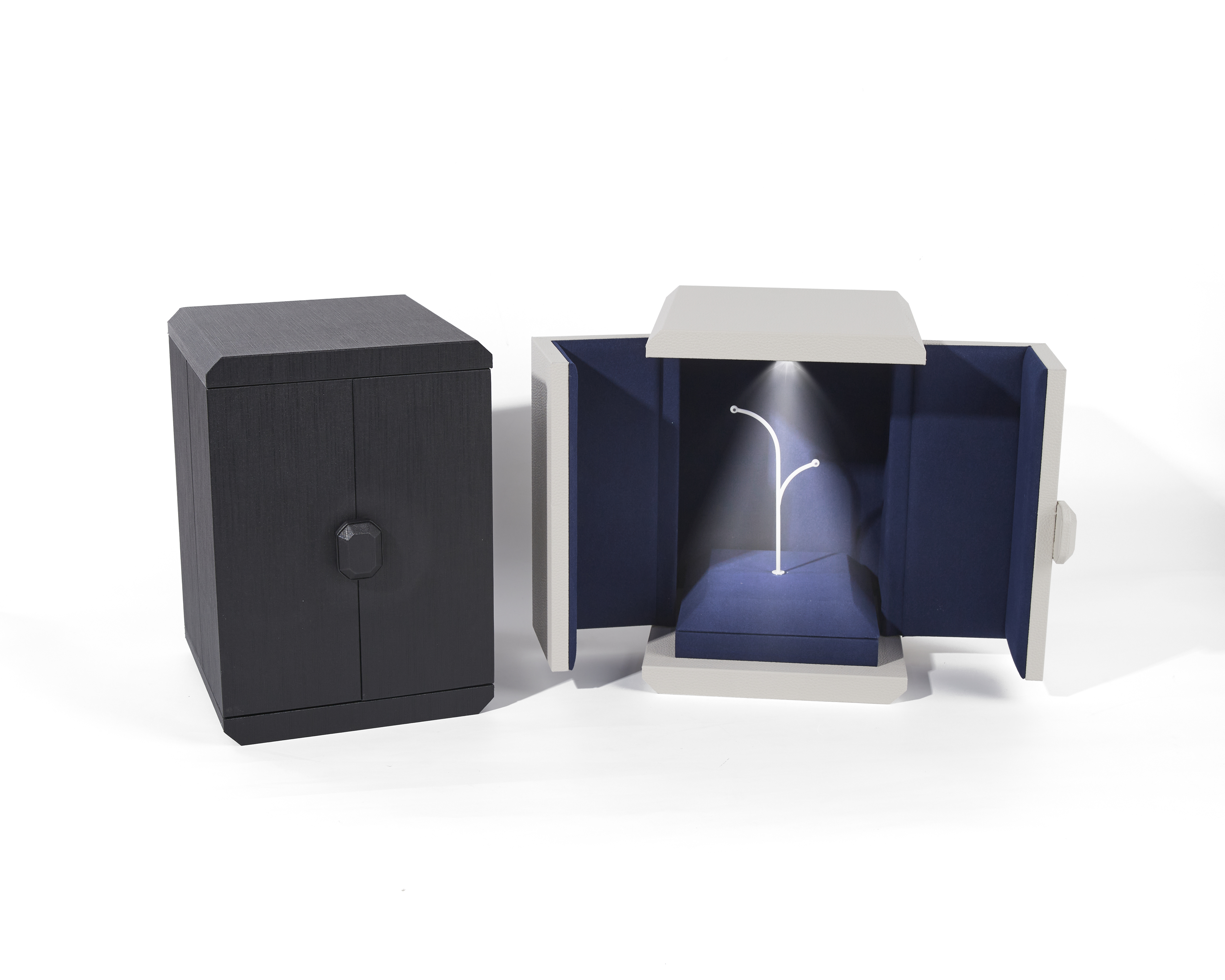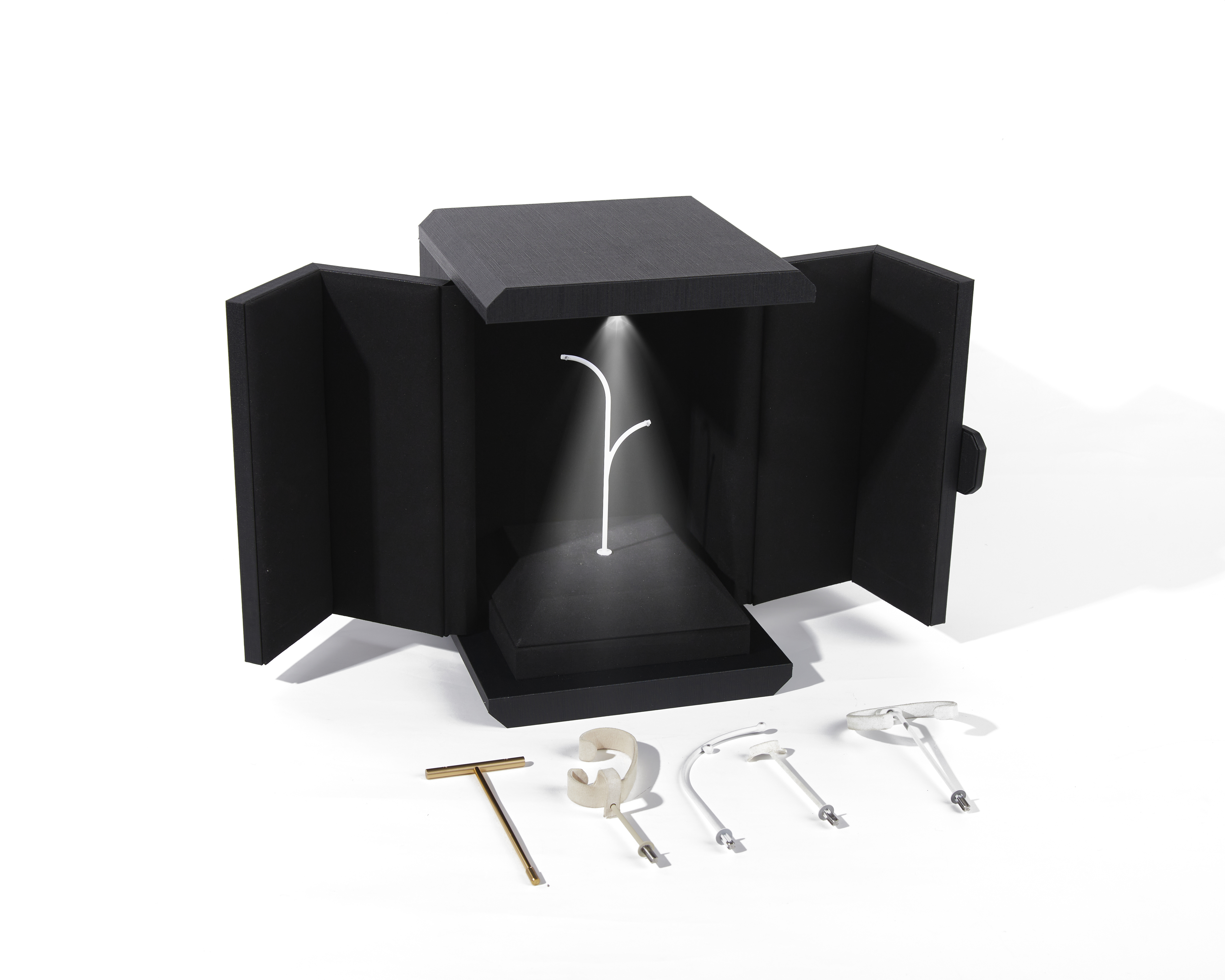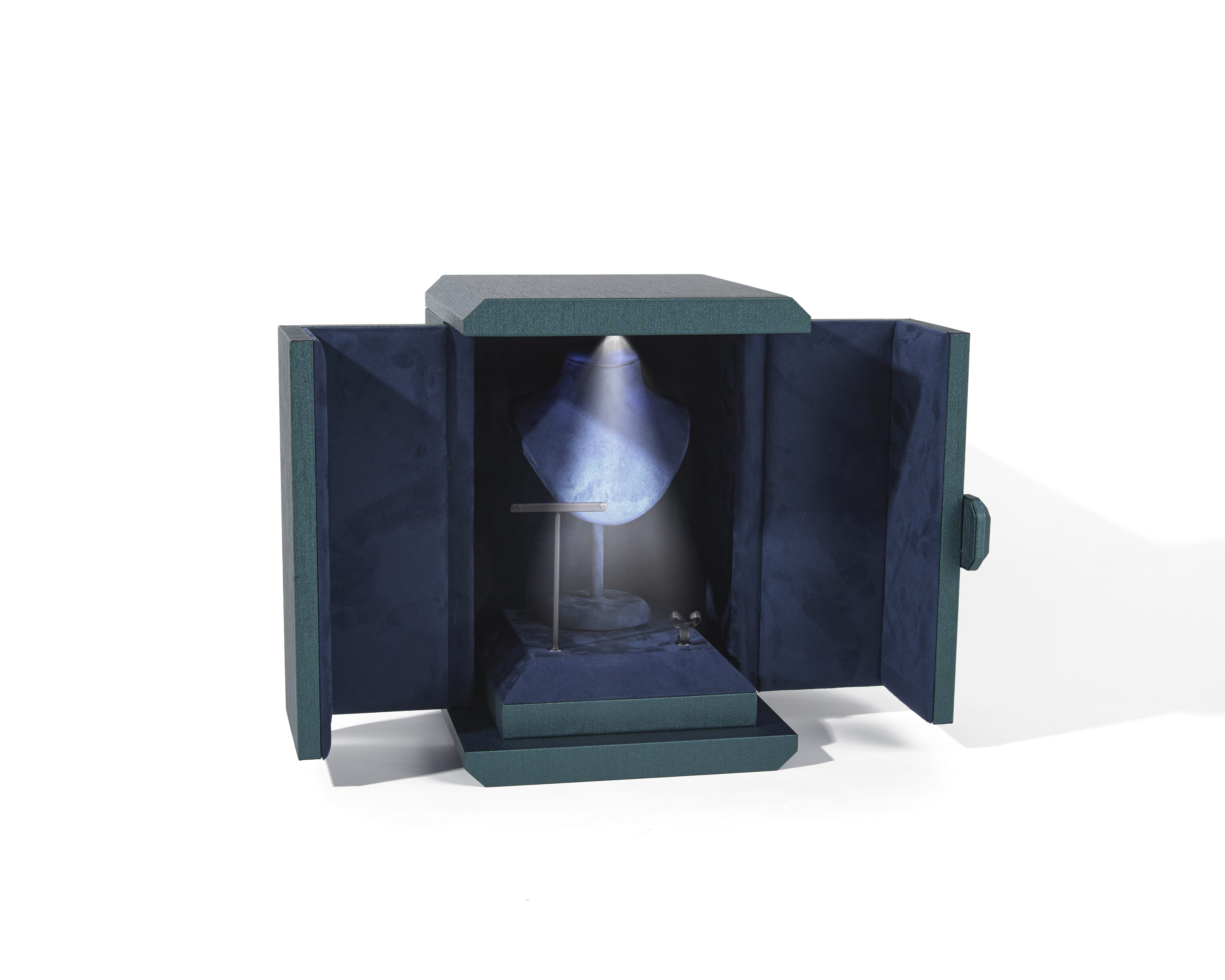 New jewellery display case, premium quality, designed to showcase the sophistication of fine jewellery. Features a magnetic inner core for easy replacement. LED lighting illuminates the brilliance of diamonds or gemstones, though installation is optional. Customisable materials and logo available.