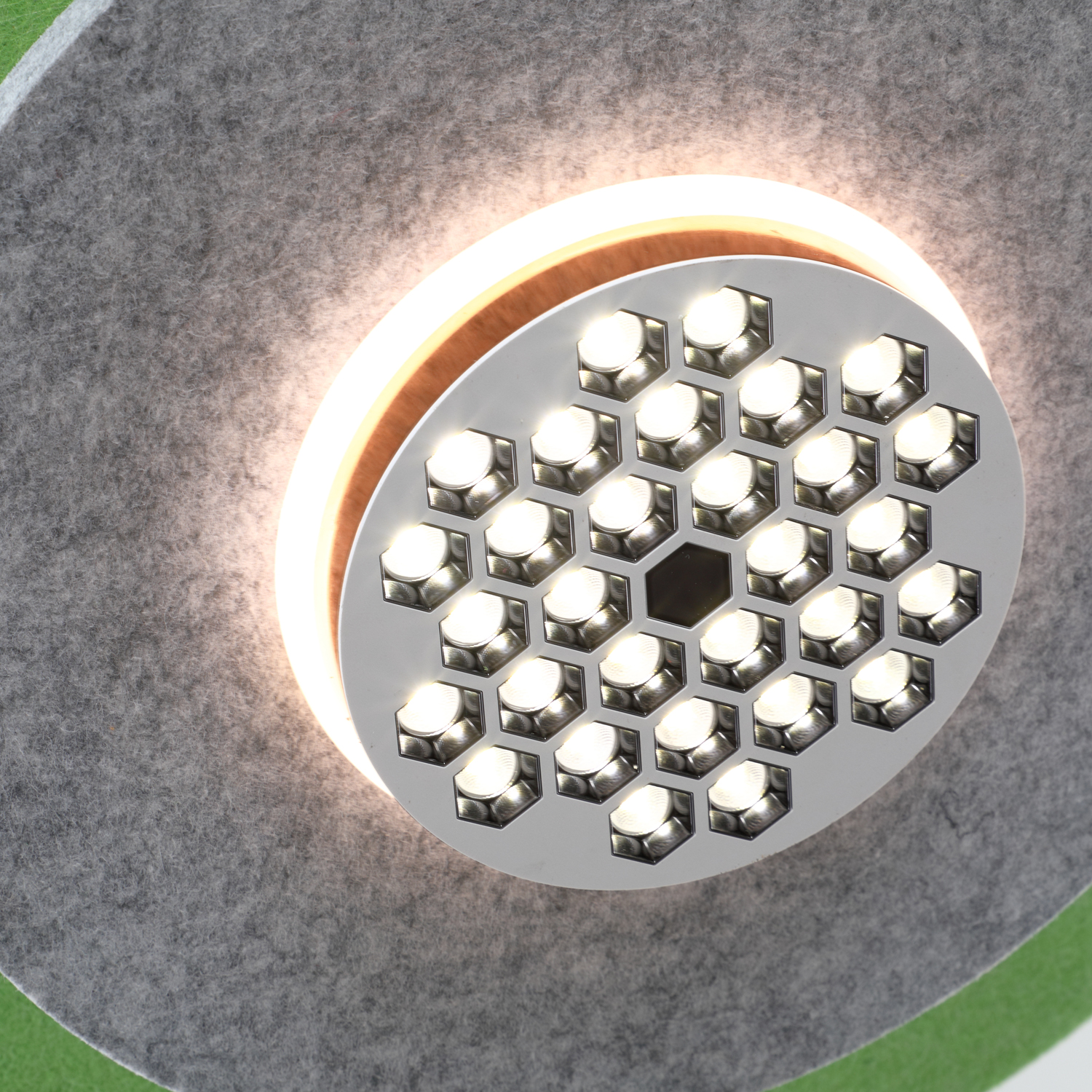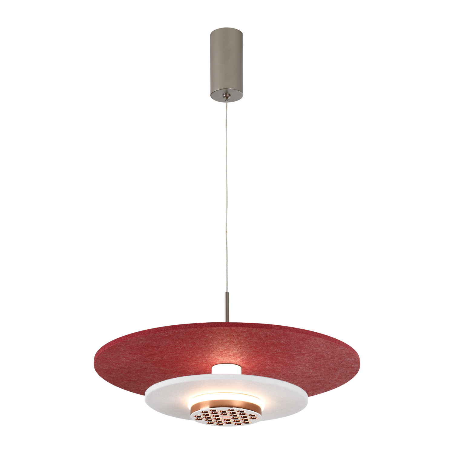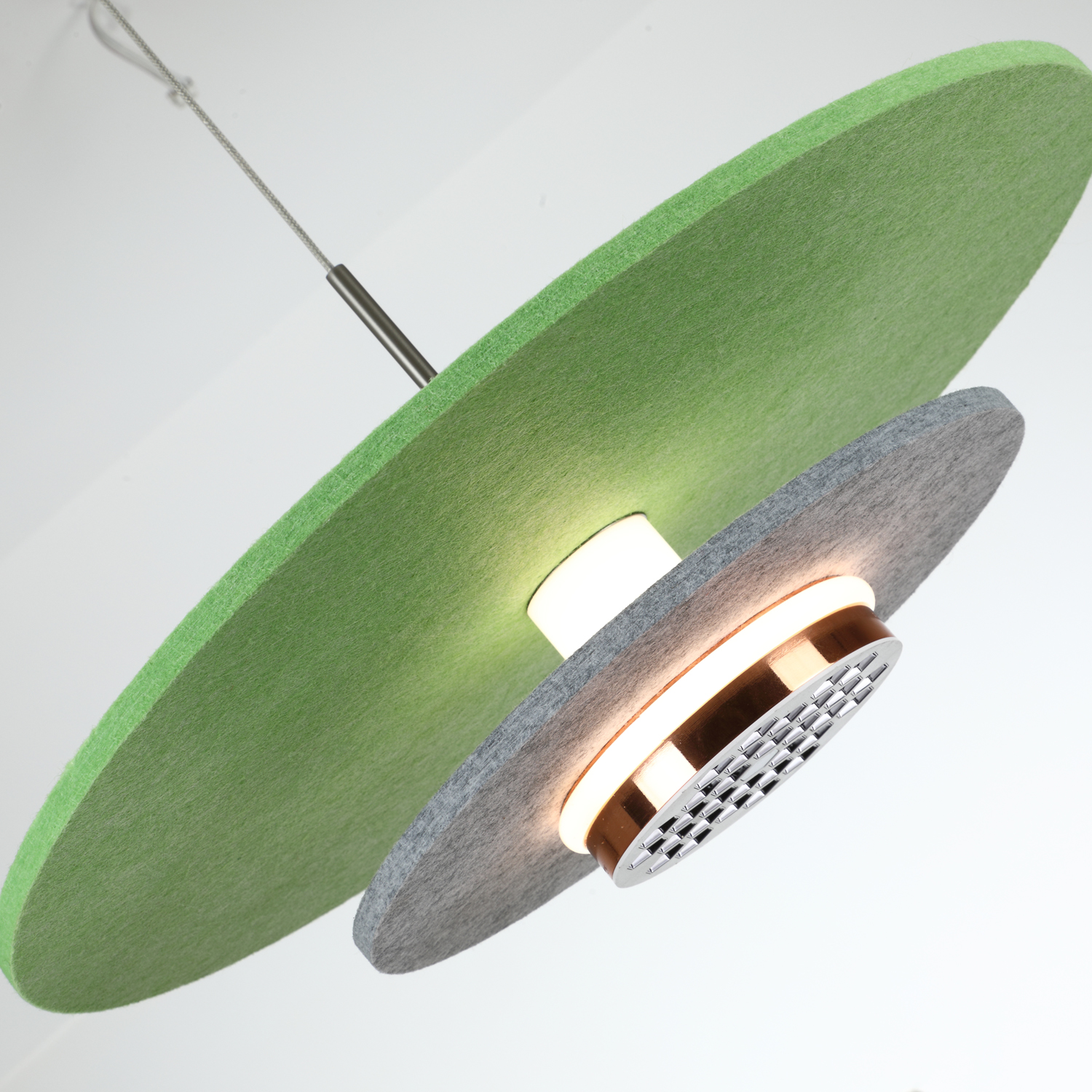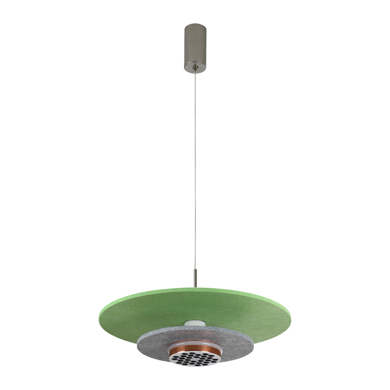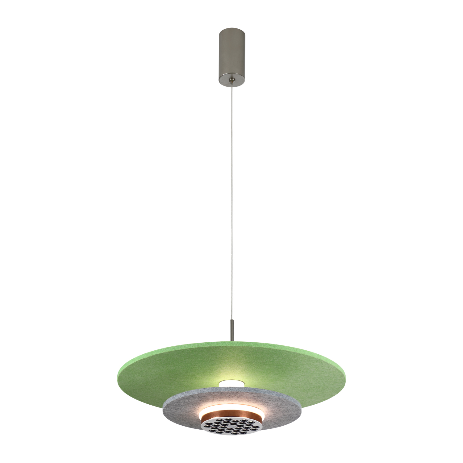 This pendant light features a minimalist and modern design, composed of two circular disks. The upper disk is made of matte green material, while the lower one is a dark gray honeycomb镂空 disk. A soft warm light shines through the space between them. It is suspended by a thin metal wire connected to a silver cylindrical mounting fixture, creating a lightweight structure with geometric elegance. The color scheme combines understated tones with a touch of vibrant green, making it suitable for modern residential or commercial lighting spaces.
