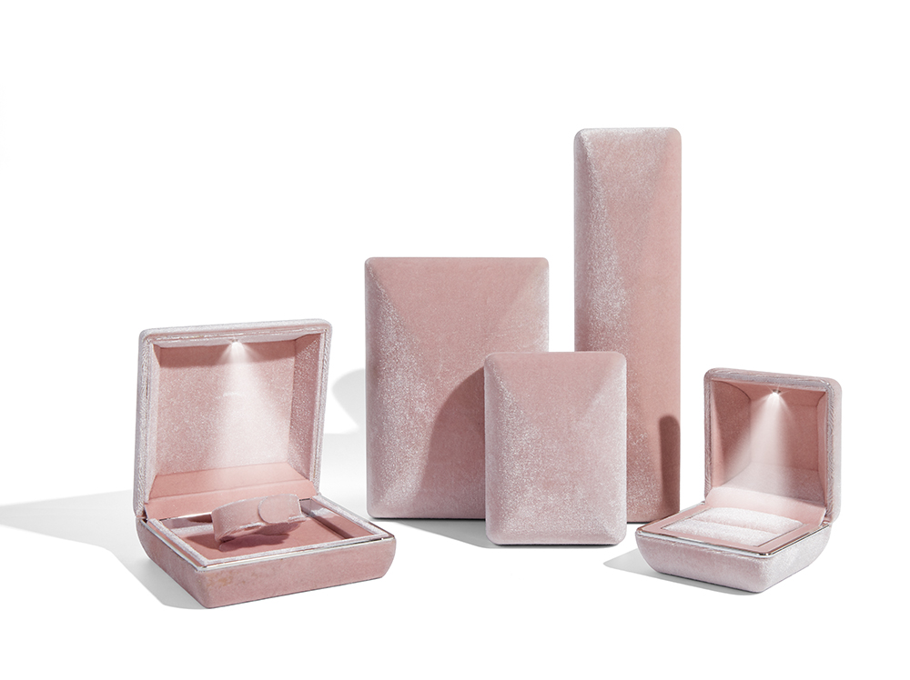 LED jewellery box, velvet fabric with silver-edged trim. Customisable materials and logo available.