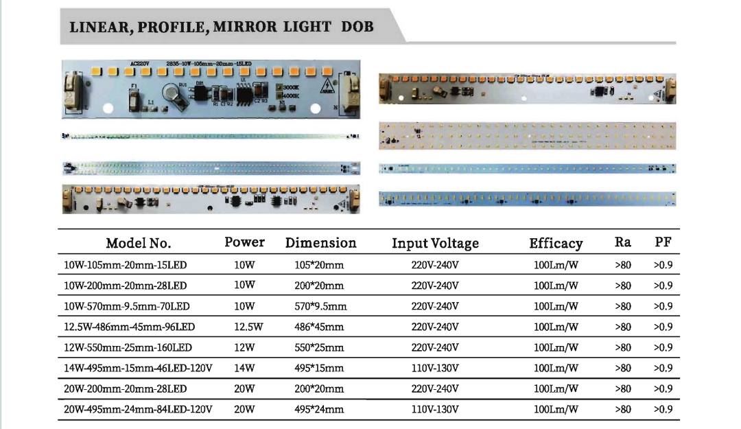 | 10W-105mm-20mm-15LED | 10W | 105*20mm | 220V-240V | 100Lm/W | >80 | >0.9 |
