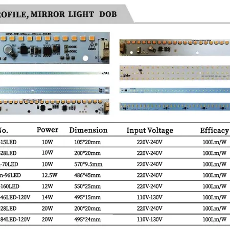 | 10W-200mm-20mm-28LED | 20W | 200*20mm | 220V-240V | 100Lm/W | >80 | >0.9 |