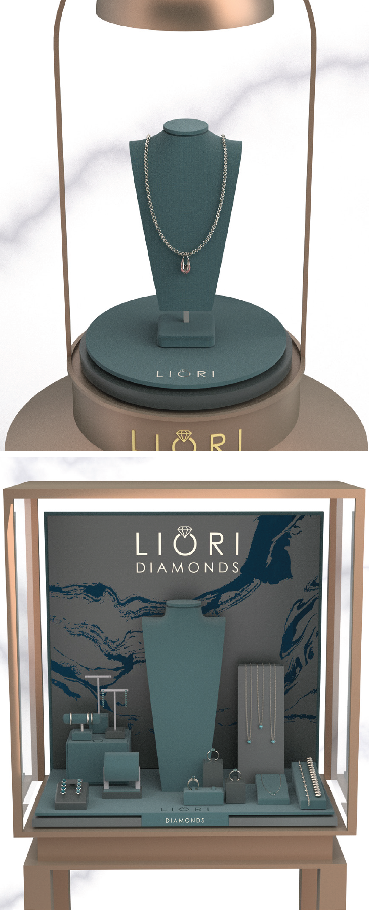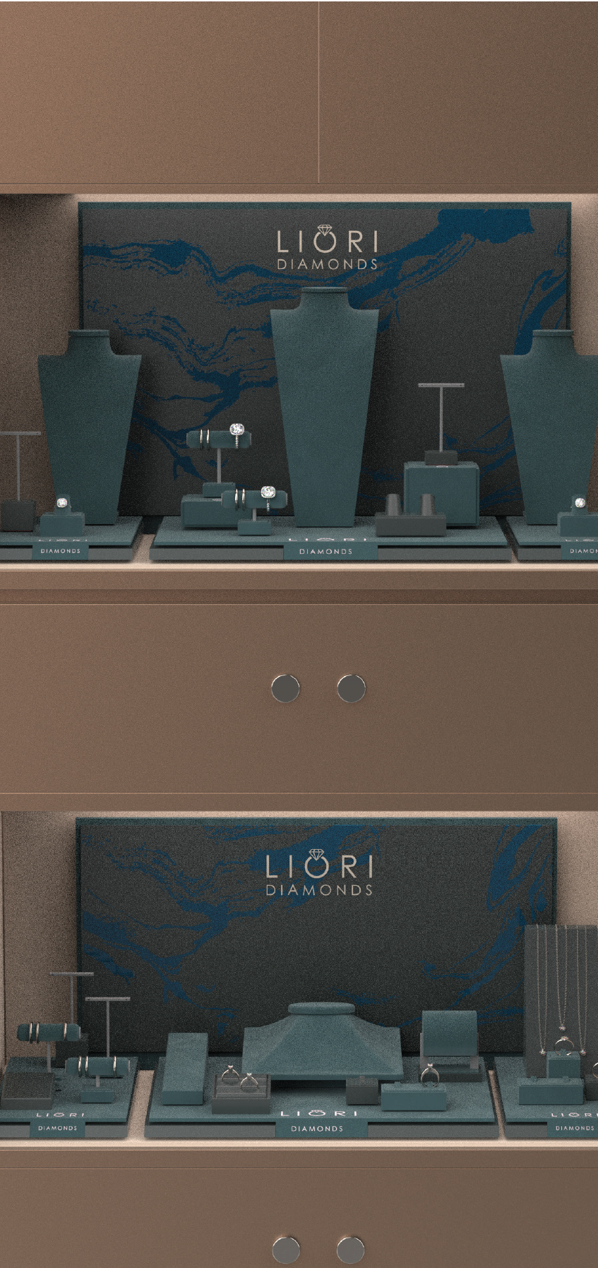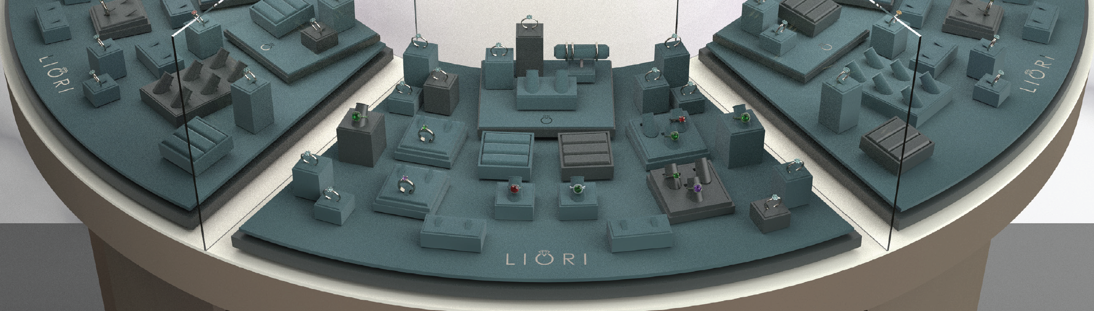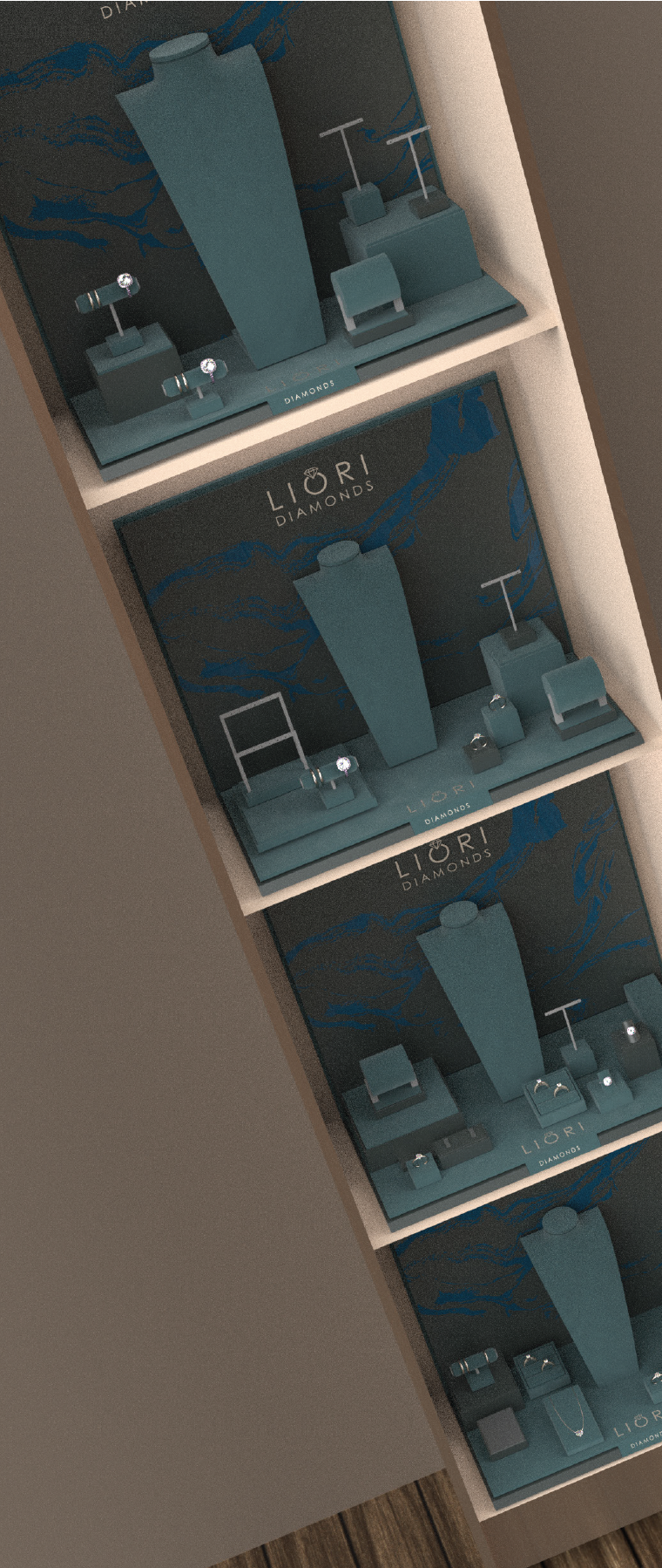 For Liori Diamonds, a US customer, we created a concept store with beautifully designed leatherette and microfibre displays. The silver logo and screen-printed texture complement the elegant presentation of the diamonds.