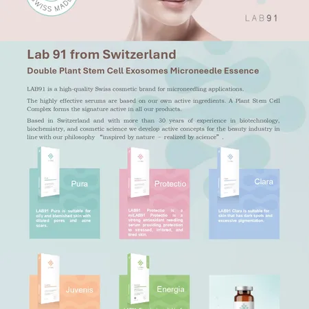 LAB91 is a high-quality Swiss cosmetic brand for microneedling applications. The highly effective serums are based on our own active ingredients. A Plant Stem Cell Complex forms the signature active in all our products. Based in Switzerland and with more than 30 years of experience in biotechnology, biochemistry, and cosmetic science we develop active concepts for the beauty industry in line with our philosophy “inspired by nature – realized by science”