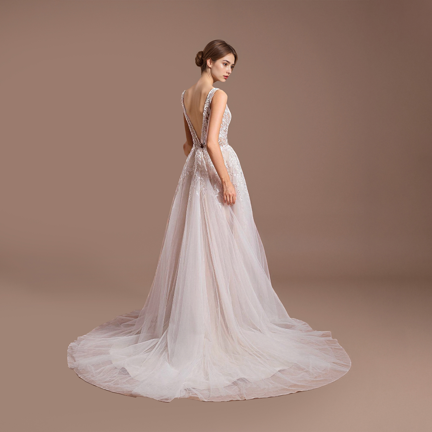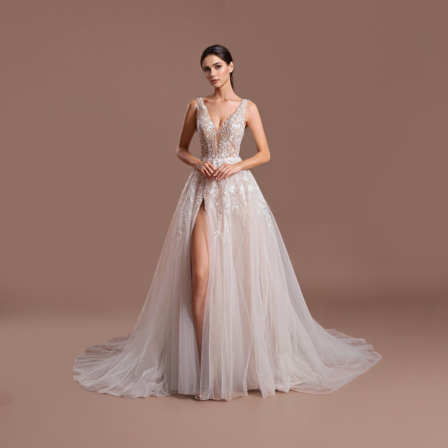 This enchanting wedding dress features delicate lace appliqués cascading over soft tulle, creating a romantic and ethereal look. The intricate detailing adds a touch of vintage charm, making it perfect for a dreamy outdoor ceremony.