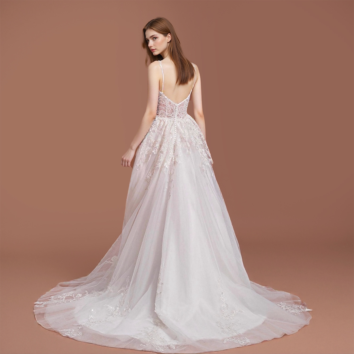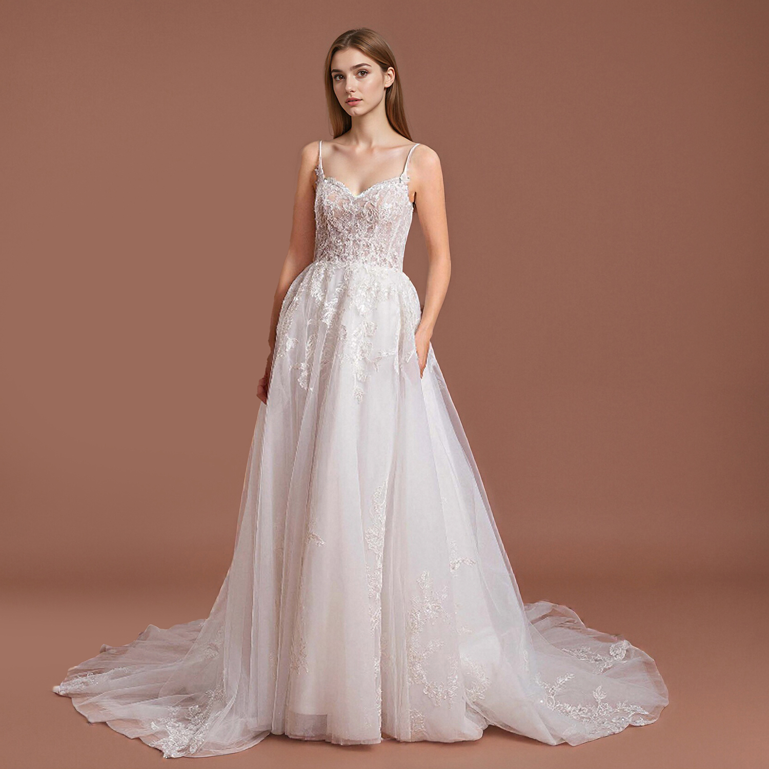 This mermaid gown showcases intricate lace embellishments that create a stunning visual impact. The fitted design hugs the body elegantly, while the flared bottom adds drama, making it an exquisite choice for a glamorous wedding.