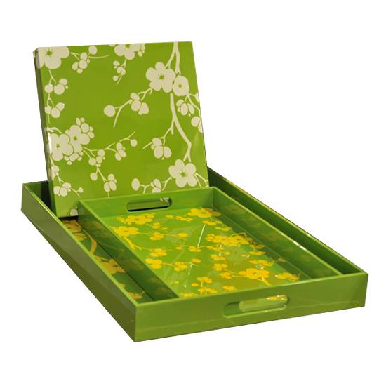 The lacquered trays are made of durable MDF wood. The trays are painted in refreshing, sharp colours and treated with lacquer. The trays feature attractive floral designs with yellow and white oriental flowers. The trays have eyelet handles for convenient use.