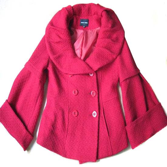The featuring garment is a ladies' long-sleeved jacket made of 50.3% wool and 49.7% viscose. It is sharp pink in colour with a lotus-leaf-like collar and two columns of round buttons on front.