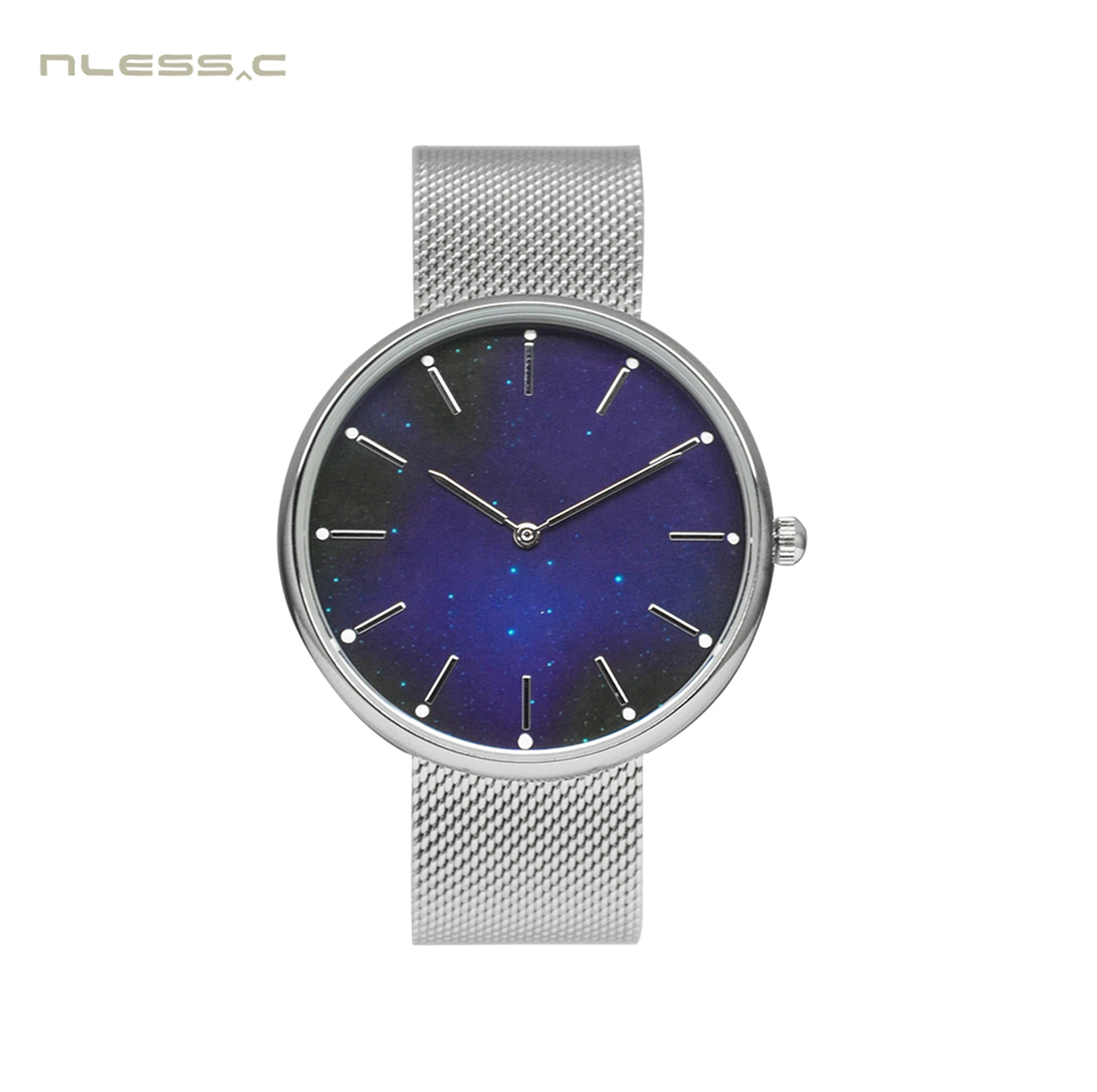 Alloy case in with silver plating, stainless steel mesh band, stainless steel backcase