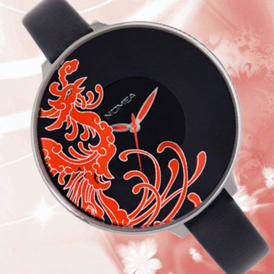 This stylish analog watch boasts a round stainless steel case in silver-tone. It comes with a polished black dial and red hands. The red phoenix-like print on the lens showcases a touch of uniqueness. This sophisticated watch is an excellent addition to any accessory collection.