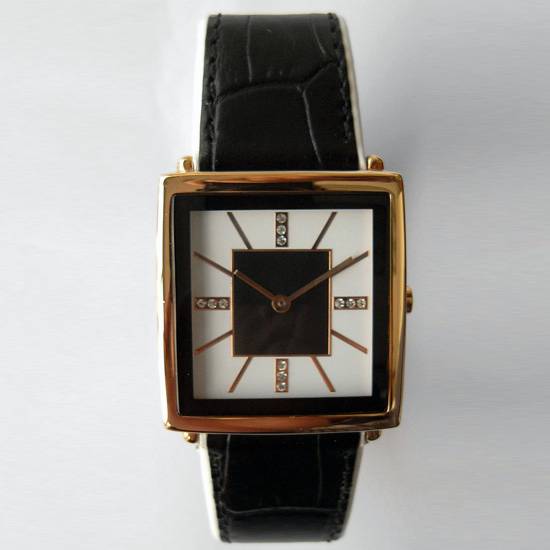 This ladies' watch features a squared shape stainless steel case with genuine leather straps. It boasts a white dial with crystal-inlaid hour markers for added style. This wristwatch is a great item for ladies' collection.