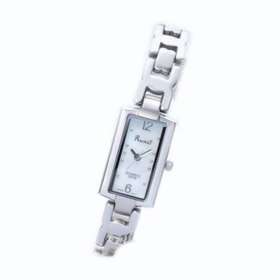The ladies' analog watch features a stainless steel construction for long-lasting durability. The watch has a rectangular bezel equipped with slender hands and quarter hour markers. The sleek, silvertone design makes this watch a great fit for a variety of fashion outfits.