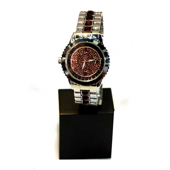 This ladies' analog watch boasts a stylish design. The exquisite bezel encases a round dial, which is all embedded with tiny glistening stones. The watch goes with a jewelry clasp and a Singapore movement. This watch is a stylish wrist accessory for a good cause.