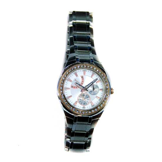 This is a ladies' automatic watch with a stainless steel construction for lasting durability. The bezel with shimmer stones flaunts a touch of glamor. This stylish automatic watch is a good accessory for ladies' outfits.