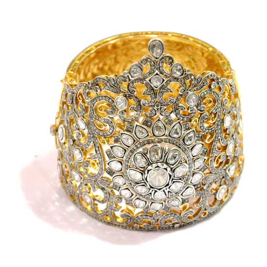 Highlighted is a ladies’ bangle featuring a broad cut-out band. The exquisite patterned band is adorned with dazzling rose-cut diamonds. This remarkable bangle gives out gorgeous sparkles to capture ladies’ hearts.
