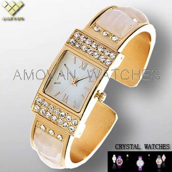 The glamorous bangle watch features a rectangular bezel encrusted with shimmering crystals. The sleek Roman-numeral and tubular hour markers showcase timeless elegance. Stay on time with this gold-tone bangle analog wristwatch.