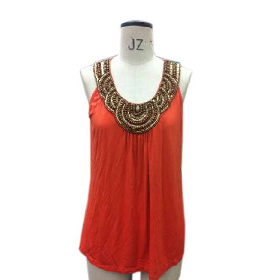 This is a ladies’ beaded blouse that comes in allover red for a sense of vitality. The allover shimmering bead ornaments on the classic round necklace add a touch of style to the whole piece. This elegant blouse is an ideal addition to complete your wardrobe.