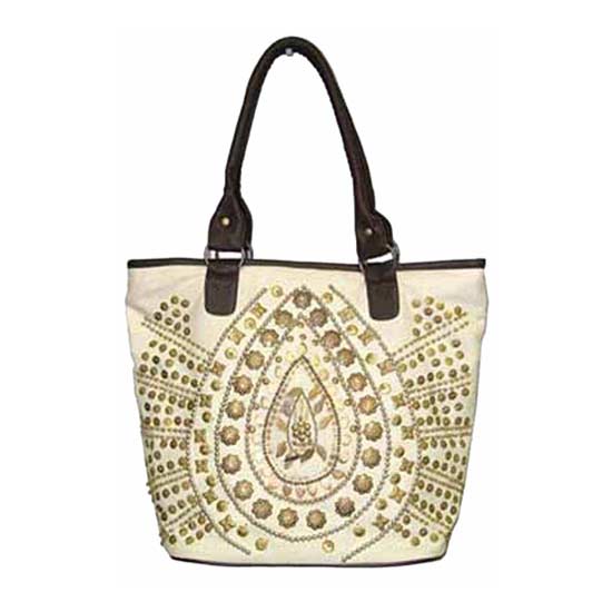 The ladies' beaded handbag is made of cotton dyed canvas with double PU handles. The heavily embellished front boasts an artistic and ethnic touch. The trapezoid compartment provides plenty of room for your belongings.