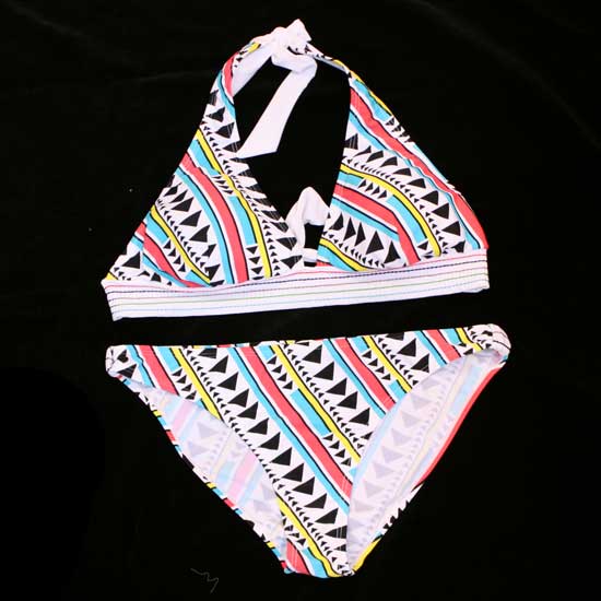Shown here is a ladies' 2-piece swimwear set featuring a push-up halter top and a pair of low-rise panties covered in colorful geometric prints. It is well styled for optimal support and shaping. Play with the sunshine with this bikini set.