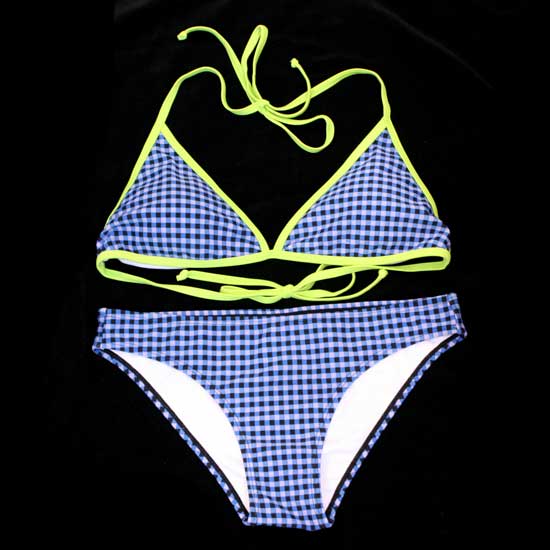 Shown here is a 2-piece bikini set featuring a self-tie triangle top and a pair of low-rise bottoms. They come in a classic plaid construction with trimmed borders, showcasing a retro look. Play with the sunshine on the beach in this check bikini set